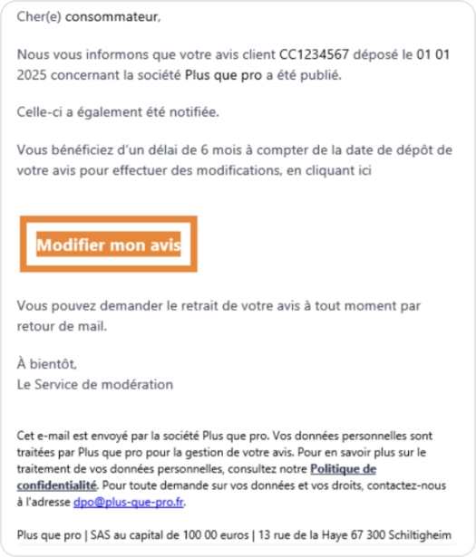 L’auteur d’un avis est le seul à pouvoir modifier son contenu, pendant 6 mois à partir du lien présent dans la notification de publication, soit en contactant Plus que pro par mail :